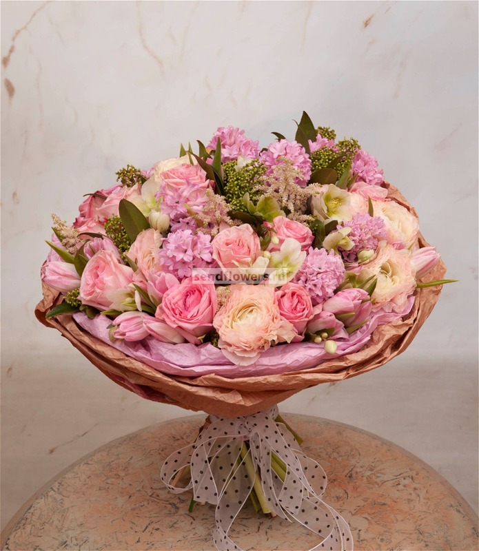 Состав: Салал (15), Хелеборус белый (10), Лента натуральная (декоративная) (5), Гиацинт розовый (9), Астильба розовая (5), Ранункулюс Клуни розовый (9), Скиммия зеленая (3), Роза Пинк Охара (12), Тюльпан Династия (20), Бумага жатая влагостойкая (4)